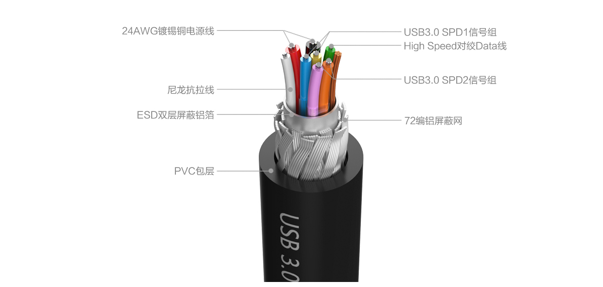 業(yè)內USB3.0線材供應商,選用帶屏蔽的無氧銅芯線,傳輸供電性能、運行速度和穩(wěn)定性都大幅提升。
