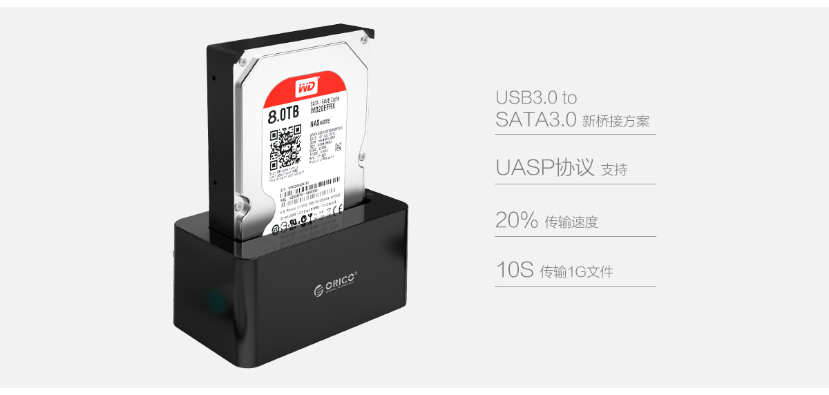 ORICO 6619C3采用USB3.0 to SATA3.0橋接方案,不僅傳輸速度快、供電足且兼容性好,還支持UASP協(xié)議。該協(xié)議提供大容量儲存設備的傳輸速度高達20%,降低CPU的利用率、數據延遲和等待時間。配合高性能SSD固態(tài)硬盤傳輸1G文件大概需要10s。
