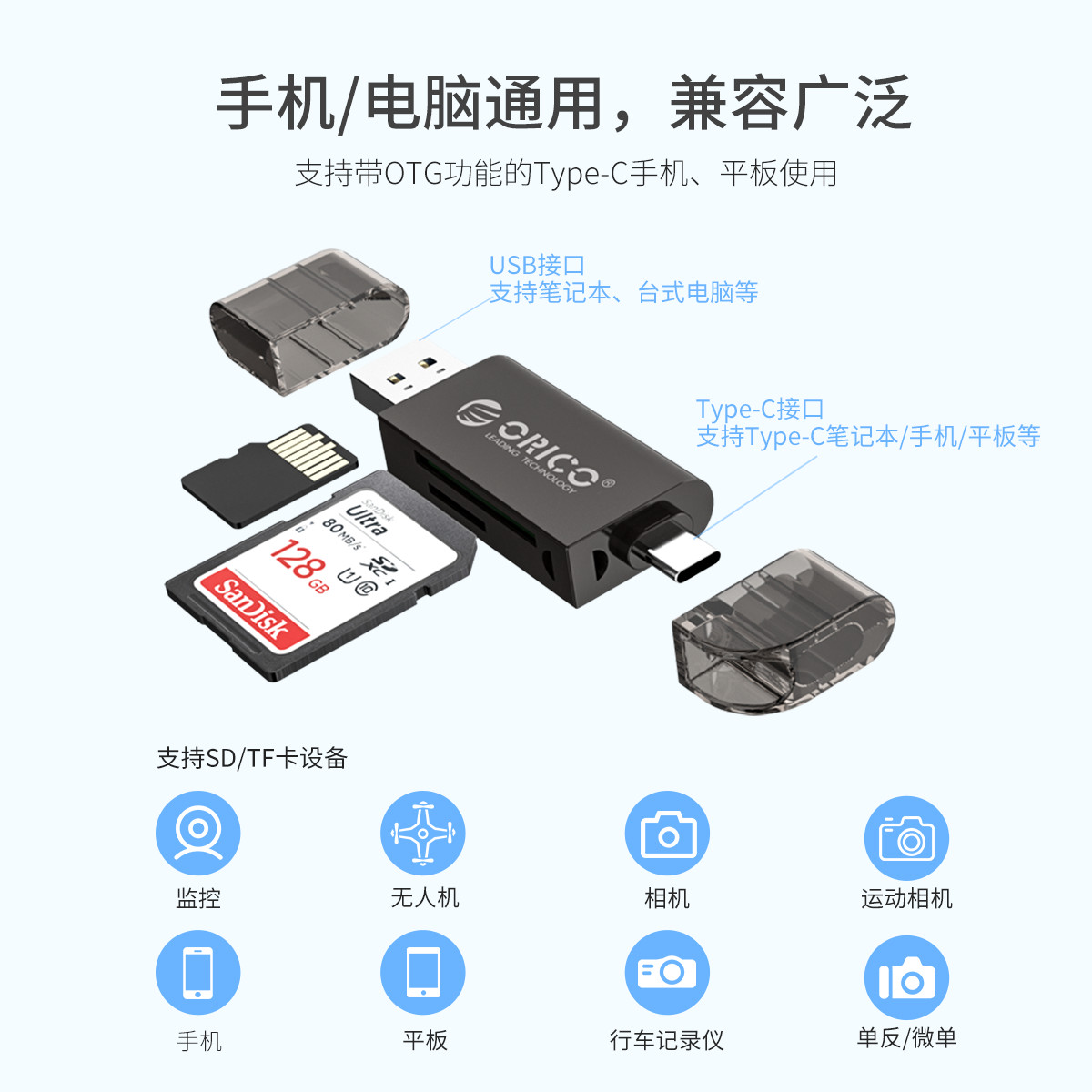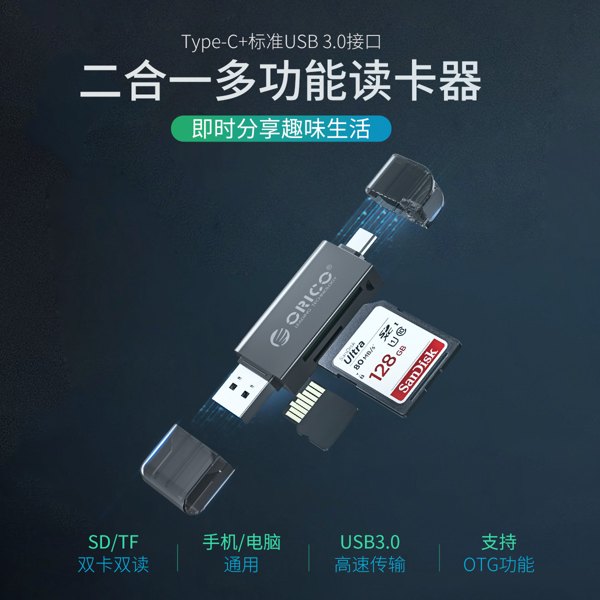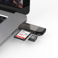 SD/TF雙卡槽,USB3.0告訴讀取,支持OTG,手機/電腦通用,多系統免驅,鋅合金+ABS外殼,輕盈小巧。