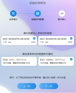 勾選需加入系統池的磁盤(默認全勾選) , 根據需求選擇需要的 磁盤陣列模式。點擊“下一步”。