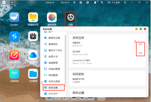 1.點擊首頁的“設置”,選擇“系統設置”,進到系統信息界面。 點擊設備名稱或者主機名稱后面的“修改”字樣進行名稱修改。