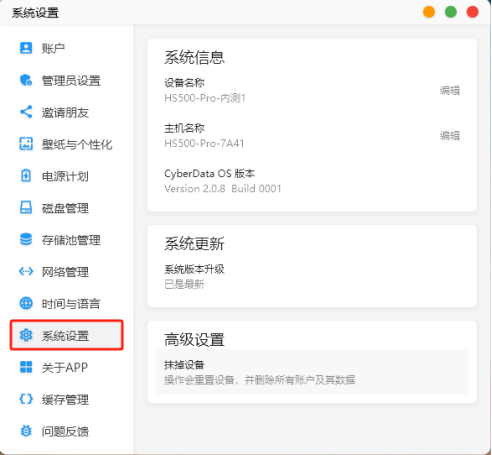 在系統設置界面可以修改設備名稱和主機名稱,也可以查看到目前的系統版本,并對設備進行升級。在高級設置里還可以對設備進行抹掉處理。