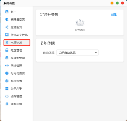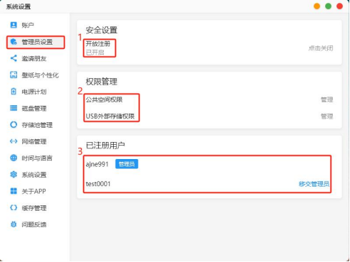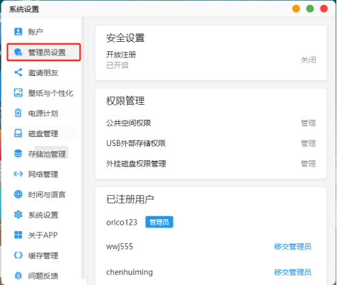 管理員賬號的“系統設置”界面比普通用戶多了四個頁面,分別為管理員設置、邀請朋友、電源計劃和系統設置。