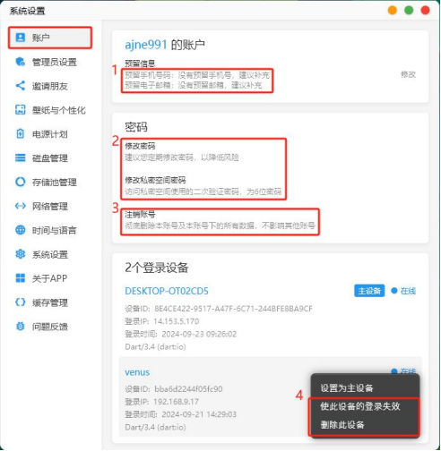 (1)可以增加賬號的預留手機號碼和電子郵箱,如果忘記賬號密碼可以通過預留信息來修改密碼。 (2)可以通過定期修改密碼來增加設備的安全性。 (3)如果賬號不使用了可以對賬號進行注銷。 (4)當 NAS 在多個設備上進行登錄時,可以對登錄的設備進行下線,或刪除該設備的登錄信息。