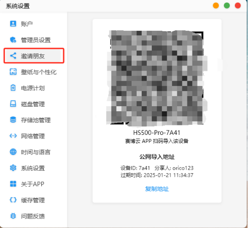 在邀請朋友界面,可以生成設備邀請二維碼和公網導入地址,以便分享設備給其他人使用。